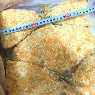 | 原材料、食品添加物: | 衣(パン粉、小麦粉、澱粉大豆粉、食塩、でん粉、粉末油脂、大豆粉、植物油)バナメイエビ、加工澱粉、着色料(アナトー色素)、pH調整剤、(乳由来原材料を含む) |